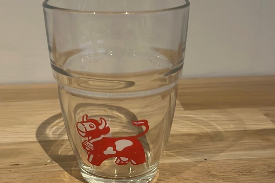 Ett glas med Arlas klassiska röda ko-logotyp. Perfekt för mjölk eller annan dryck.