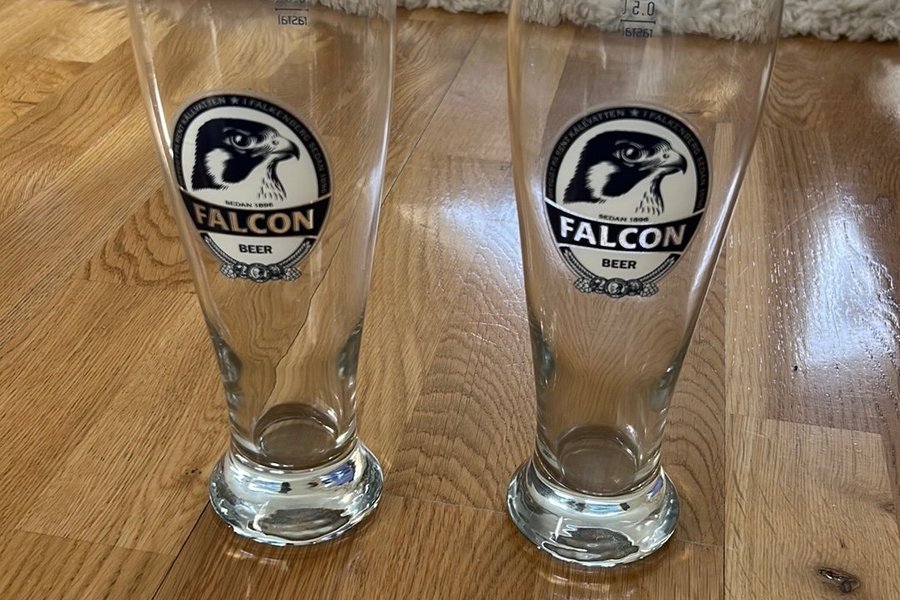 Ett par Falcon ölglas med guldkant. Glasen har texten "FALCON BEER" och "SEDAN 1896" samt en bild på en falk. Varje glas rymmer 0.5 liter.