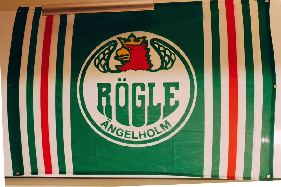Stor och fin Rögle BK-flagga. Köpt för runt 25 år sedan. Flaggan mäter 65x80 cm och är tillverkad i polyester och är i nyskick.