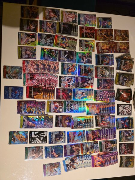 4 st law från op14, 8 st Nami op14 , 2 st Rayleigh op13 , 2 st crocodile op09 , 4 st bentham op14 , 2 shanks op13 , 8 st foxy eb04 , 4 st perona op14 , 4 st vivi eb04 , 4 st moria op14, 4 st ace o sabo o luffy op13 , 5 st carrot eb04 , 4 st luffy op14 , 2 st jinbe op14 , 2 st rosinante o law eb04 , 2st newgate st15 , 3 st Hawkins op07 , 2 st marco prb02 och dom andra är en st. JÄTTE FINNA KORT