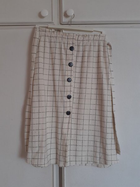 En rutig kjol med knappar framtill. Kjolen har en resår i midjan och en slits på ena sidan.