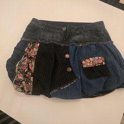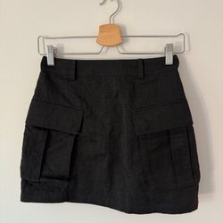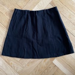Svart kjol i storlek 34 - jag har normalt storlek S/34 och den sitter bra på mig. Elastiskt på sidorna av midjan, fickor på båda sidorna och dragkedja bak.