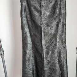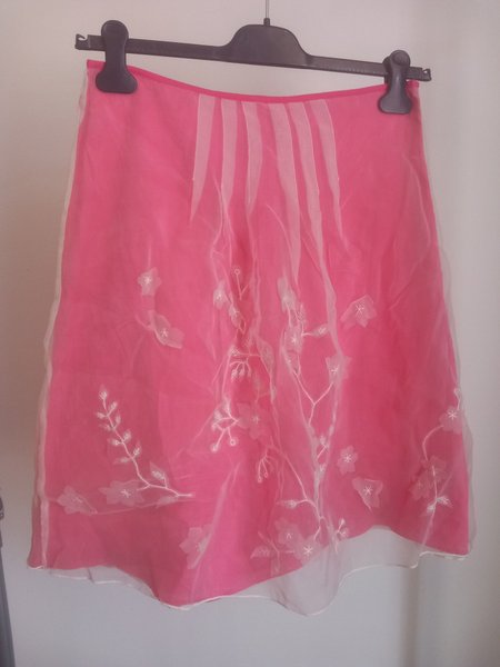 Deze roze rok heeft een transparante overlay met witte bloemmotieven en bladeren. De rok heeft een effen roze onderlaag en een golvende zoom. De tailleband is voorzien van verticale, transparante stroken.