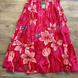 En lång kjol med ett livfullt mönster i blått, orange och gult. Kjolen har en smockad midja som ger en bekväm passform och ett flytande fall. Mönstret består av intrikata, symmetriska former som påminner om paisley, vilket ger kjolen en bohemisk känsla. Den är designad för att vara luftig och passar bra för varmare väder eller som en del av en avslappnad outfit. Längd 99cm mitt fram och bak. Kortare vid sidorna. Köpt på Copenhagen luxe. Material Art silk 80% polyester 20%