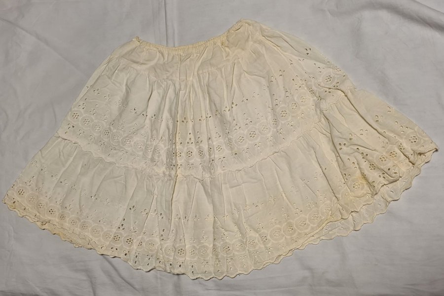 Vit kjol med broderade detaljer och resår i midjan. Kjolen har en vågig fåll och ett dekorativt hålmönster.