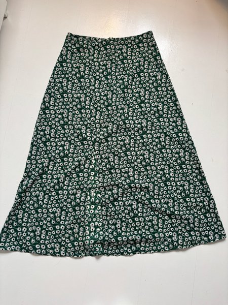 En grön kjol med ett heltäckande mönster av små vita blommor. Kjolen har en dold dragkedja i sidan och en lätt utsvängd passform. Inte använt mycket och är i bra skick. Är köpt från Qhiquelle.