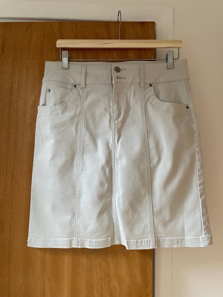 Stretchig bomullskjol i en ljusbeige nyans med fickor framtill och bälteshällor. Kjolen har synliga sömmar som löper vertikalt både fram och bak, vilket ger en strukturerad look. Stl 38, mycket bra skick.