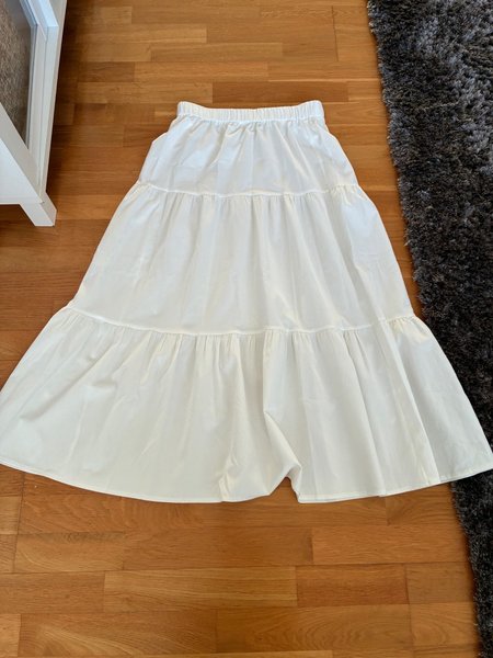 Vit lång kjol med resår i midjan och volanger. Kjolen har en lös passform och är perfekt för varma dagar. L men mer som en M