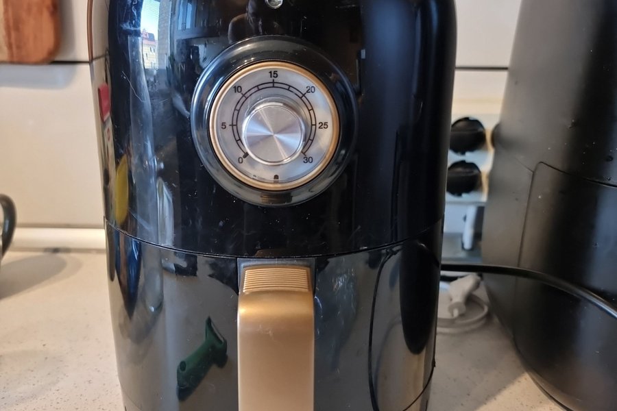 Airfryer i svart och guldfärg. Den har en timerfunktion som går upp till 30 minuter. Enheten har en strömkabel.