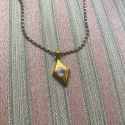 Ett elegant guldfärgat halsband med ett ovalt hänge. Hänget har en ljus, pärlemorskimrande sten i mitten, omgiven av små, gnistrande stenar. Kedjan är fin och klassisk, vilket gör halsbandet till ett tidlöst smycke.