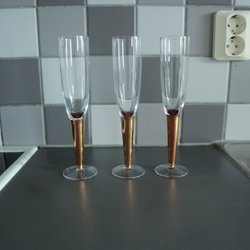 Champagneglas ett guld och ett med silverfot. design Liselotte Henriksen. vänligen bedöm skick på bilderna. Inga sprickor eller nagg, något avskavt guld/silver.