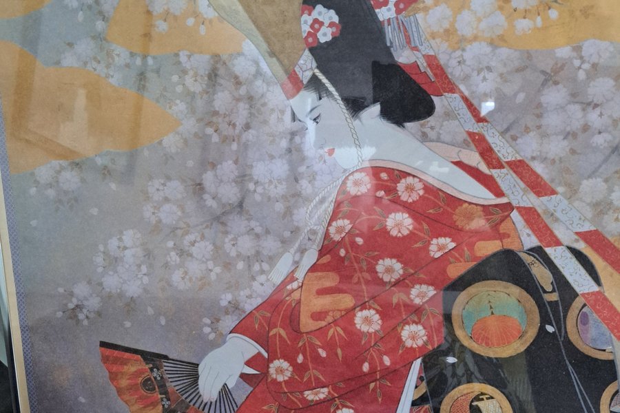 Tavla med ett japanskt motiv. Yryck på rispapper. Den föreställer en kvinna i traditionell klädsel omgiven sv körsbärskvistar och med solfjäder i handen.