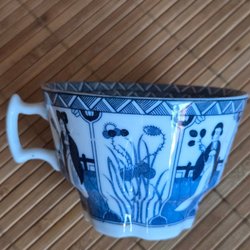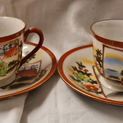 Tre japanska tekoppar med tillhörande fat och assietter. Dekorativa med detaljrika motiv.