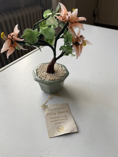 Detta är ett glasträd, handgjort enligt gammal kinesisk tradition. Trädet har detaljerade blad och blommor i glas, och står i en kruka fylld med små vita stenar.