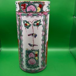 En så kallad penselvas tillverkad i Kina, närmare bestämt Macau. Okänt årtal. Höjd ca 21,7 cm, diameter ca 5,7 cm.