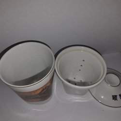 En tekopp med ett detaljerat mönster i rött, gult, blått och vitt. Koppen har ett kinesiskt tecken i mitten av mönstret.