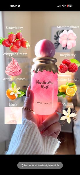 Marshmallow Blush från Paris Corner. Doftnoter inkluderar bland annat jordgubbar, marshmallows, vispad grädde, hallon, apelsinblomma, italiensk citron, mysk och vanilj.