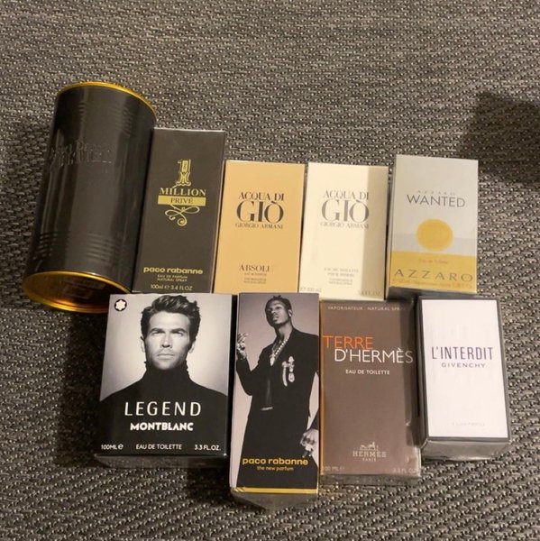 Parfym samling innehållande: Paco Rabanne 1 Million Privé, Giorgio Armani Acqua di Gio Absolu, Giorgio Armani Acqua di Gio, Azzaro Wanted, Montblanc Legend, Paco Rabanne the new parfum, Terre d'Hermès, Givenchy L'Interdit. (500kr styck skriv vilka ni är intresserade i)