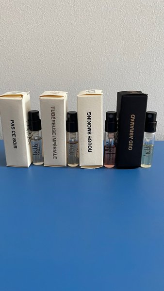 Ett set med BDK Parfums discovery rör innehållande dofterna Pas Ce Soir, Tubéreuse Impériale, Rouge Smoking och Oud Abramad.
