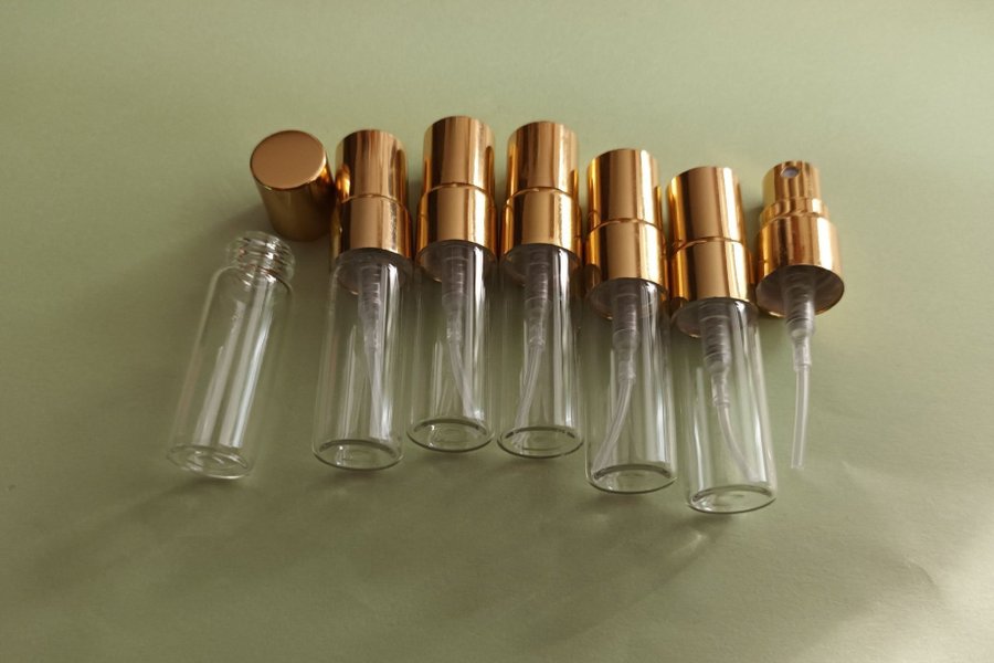Set med tomma parfymflaskor. Perfekt för att dekantera dina favoritdofter eller skapa egna blandningar. Flaskorna har en praktisk sprayfunktion och guldfärgade detaljer.