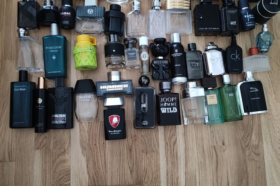 Bilden består av ett parti med olika tomma parfymflaskor från märken som Davidoff Cool Water, Missoni Wave, Giorgio Black, Hummer Chrome, Abercrombie & Fitch Authentic, Moschino, Police, Drakkar Intense, Joop! Homme Wild, Bentley For Men Intense, Franck Olivier Oud Touch, Calvin Klein CK Be, Jaguar Classic Black, Dunhill, Hugo, Tabac Man, Sergio Tacchini, Alfa Romeo, Boucheron, Victorinox Swiss Army Altitude, och Roma Uomo.
