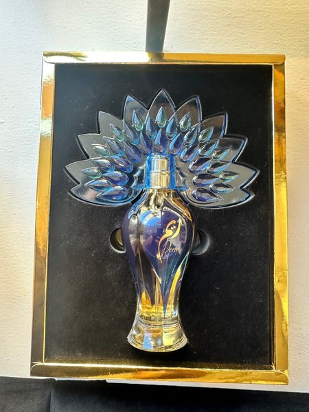 Reem Eau de Parfum i en elegant flaska med en design inspirerad av en påfågelfjäder. Flaskan har detaljer i blått och guld.