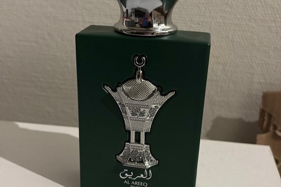 Lattafa Al Areeq Silver är en parfym. Flaskan har en grön färg med en silverfärgad detalj.