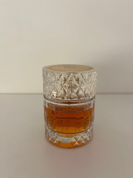En parfym i en elegant glasflaska med en mönstrad kork. Doften är varm och inbjudande.