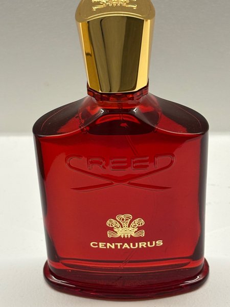 Creed Centaurus parfym i en röd flaska med guldfärgad kork och text.