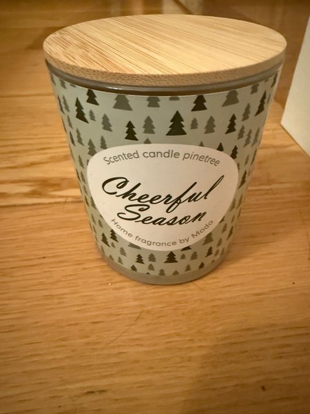 Ett doftljus med doft av pinetree. Märkt med ”Cheerful Season Home fragrance by Moda”. 25h brinntid