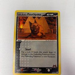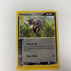 Säljer ett Pokémonkort av Poochyena. Kortet har attackerna Surprise och Sharp Fang. Perfekt för samlaren eller spelaren!