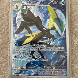 Säljer ett Pokémonkort av Inteleon. Kortet är av typen V och har attackerna Bring Down och Water Shot.