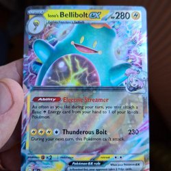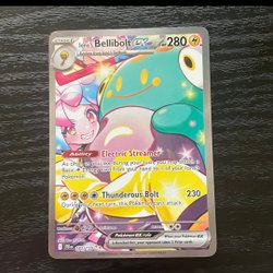 Ett Pokémonkort med Iono's Bellibolt ex. Kortet har förmågan Electric Streamer och attacken Thunderous Bolt.