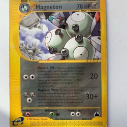 Säljer ett Pokémonkort av Magneton. Kortet är av typen Stage 1 och har 90 HP. Den har attackerna Lightning Ball och Explosion.