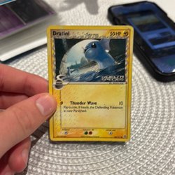 Ett Pokémonkort av Dratini. Den har attackerna Hook och Thunder Jolt.