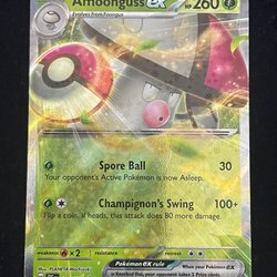 Säljer ett Amoonguss Pokémonkort. Kortet är av typen Stage 1 och har 120 HP. Den har attackerna Dangerous Reaction och Seed Bomb.