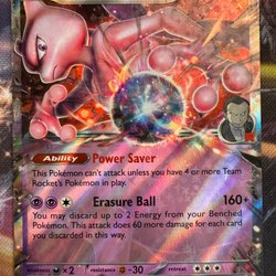 Team Rocket's Mewtwo ex Pokémonkort med evnen Power Saver og angrebet Erasure Ball.