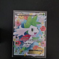 Shaymin EX Pokémonkort med angrebene Synthesis og Revenge Blast. Kortet har svaghed mod lyn og resistens mod kamp. Pokemonkort pokemon kort samling