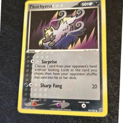 Säljer ett Pokémonkort av Poochyena. Kortet är från 2005 och har nummer 79/113.