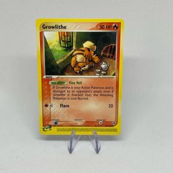 Säljer ett Pokémonkort av Growlithe. Kortet är från setet med nummer 68/105. Growlithe är en Basic Pokémon med 50 HP och attacken Bite som gör 20 skada. Illustration av Atsuko Nishida.