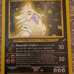 Säljer ett Tyranitar Pokémonkort. Kortet har förmågan Daunting Gaze och attacken Cracking Stomp.