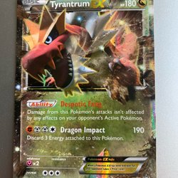 Säljer ett Pokémonkort av Tyrantrum EX. Kortet har förmågan Despotic Fang och attacken Dragon Impact.