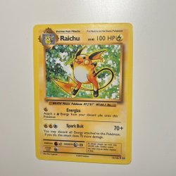 Säljer ett Raichu Pokémonkort. Kortet är av typen Stage 1 och har attackerna Thunderclap Shot och Electrosmash.