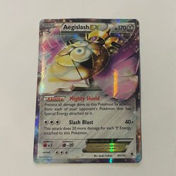 Pokémonkort av Aegislash. Kortet har förmågan Mighty Shield och attacken Slash Blast.