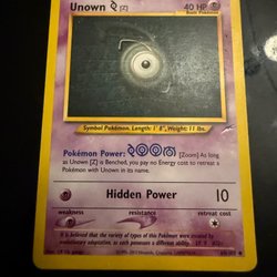 Pokémonkort av Unown []. Symbol Pokémon. Längd: 1' 8”, Vikt: 11 lbs. Deras former ser ut som hieroglyfer på antika tavlor. Det sägs att de två är något relaterade. LV. 10 #201. Från 1995-2001 Nintendo, Creatures, GAMEFREAK. 68/75