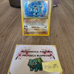 Pokémonkort Machamp från Base Set. Repig framsida samt slitage i kanterna. Se bilder