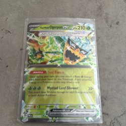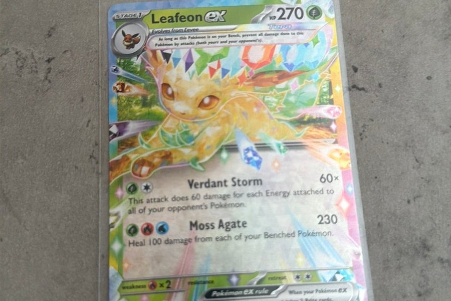 Ett Pokémonkort av Leafeon VMAX. Kortet har attackerna Verdant Storm och Moss Agate.