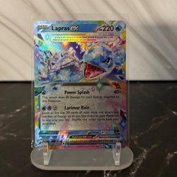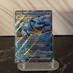 Pokemonkort Blastoise EX 009/165. Kortet är av typen vatten och har 330 HP. Det är ett Stage 2-kort som utvecklas från Wartortle. Kortet har förmågan ”Solid Shell” och attacken ”Twin Cannons”.