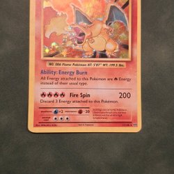 Charizard Pokemon kort fra 2002. Kortet er et Stage 2 Pokemon kort med 120 HP. Det har angrebene Burning Energy og Scorching Whirlwind.