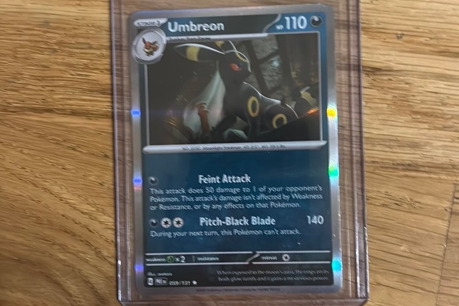 Pokemonkort med Umbreon. Kortet har 110 HP och två attacker: "Feint Attack" som gör 30 skada, och "Pitch-Black Blade" som gör 140 skada.
